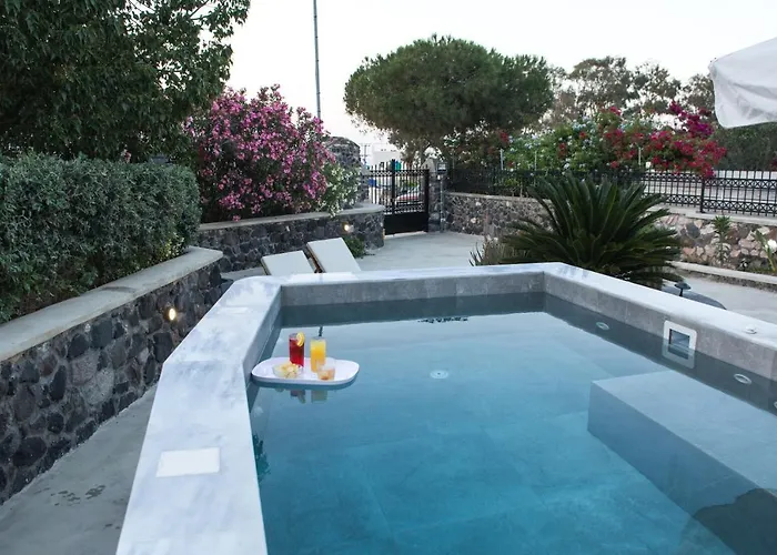 Santorini Vineyard Villa With Heated Pool Éxo Goniá med 1 sovrum, som ligger 2 km från Santorinis hamn, erbjuder gästerna bubbelpool för en mer avkopplande vistelse. Den här villan, som har en terrass, ligger cirka 10 minuters bilfärd från Ortodox katedral.